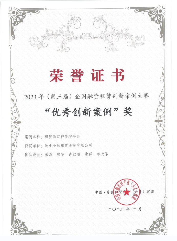 中国·东疆租赁产业(人才)联盟“2023年(第三届)全国融资租赁创新案例大赛”活动是在天津东疆保税港区管理委员会的指导下进行的,评选活动历时两个多月,经专家评审,最后评选出27个“优秀创新案例”。此次民生金租获得2023年(第三届)全国融资租赁创新案例大赛的“优秀创新案例奖”,充分体现了公司在金融科技支持数字经济工作中做出的积极探索和贡献,起到了典范作用。